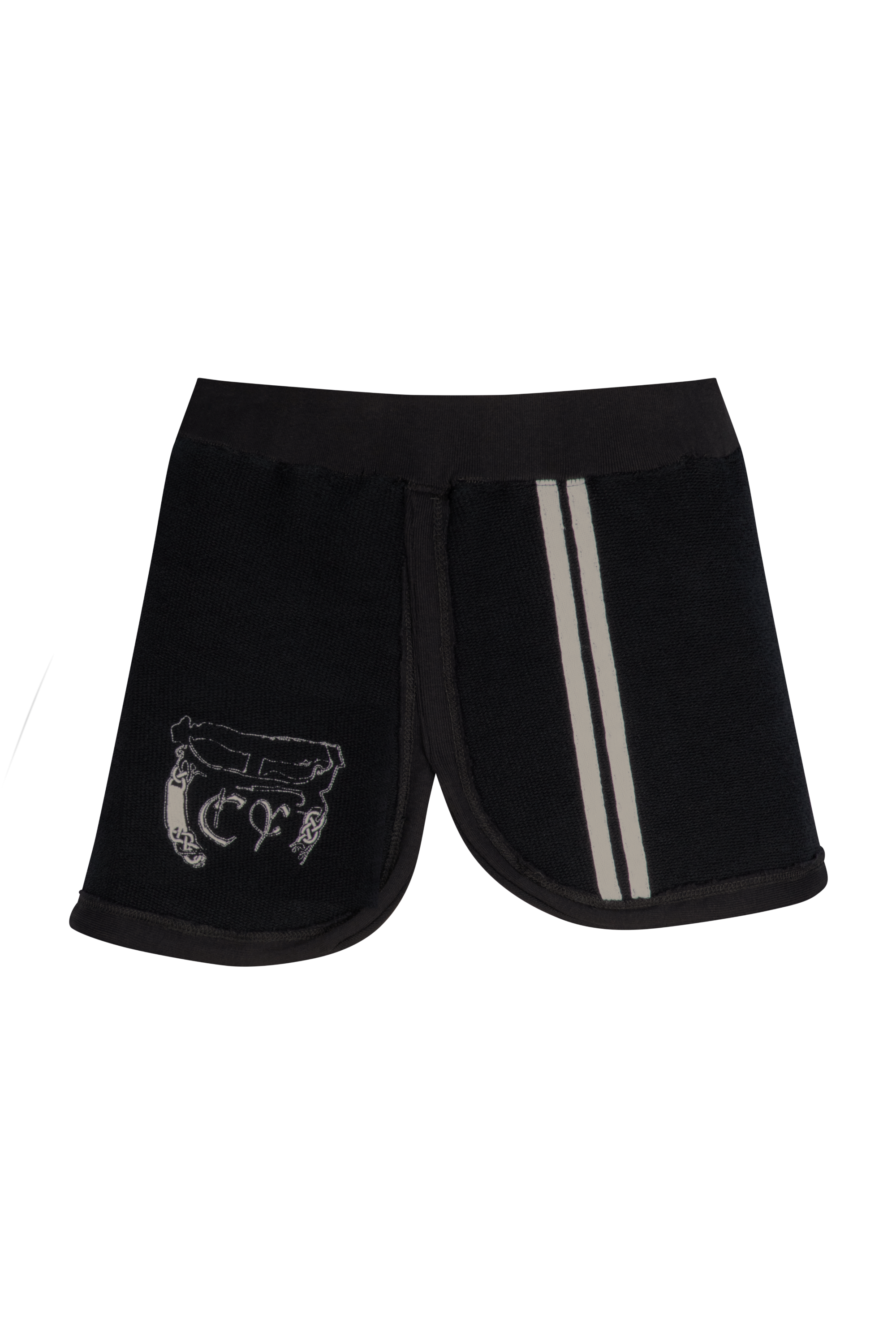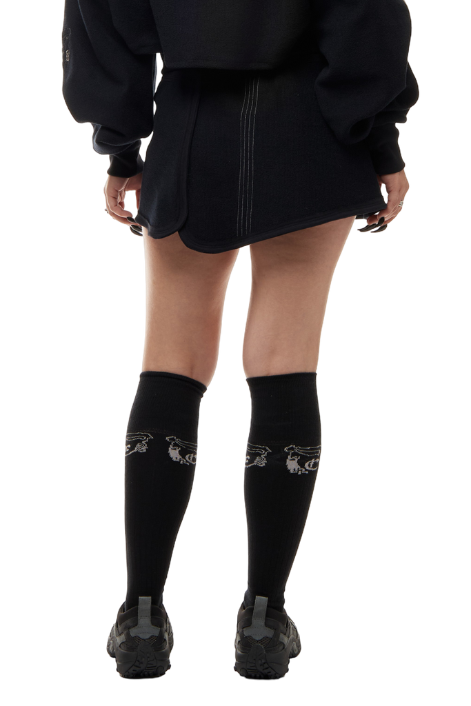 MINI LOW-RISE, ASSYMETRIC SKIRT IN BLACK REVERSED TERRY. GREIGE STRIPE TAPE, RAW RIB FINISHINGS.